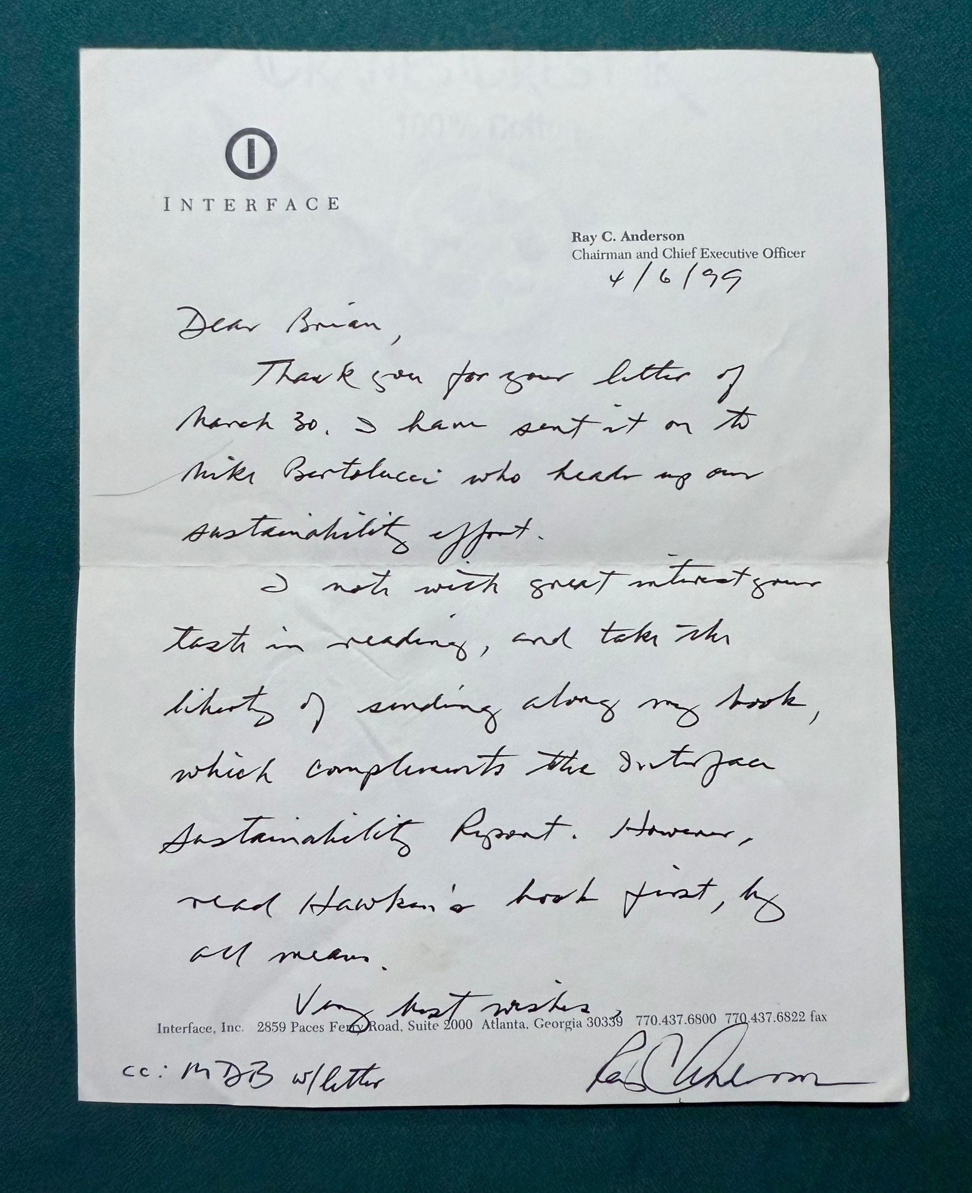 In the summer of 1998, my professor of thermodynamics at Wake Forest, Dr. Dilip Kondepudi, introduced me to Interface, Inc. and the approach they were taking to design and innovation centered on Sustainability. The following spring of 1999, I wrote to Ray C. Anderson to inquire about a job. On April 6th, he replied with a signed copy of his book, Mid-Course Correction, and a note that changed my life.