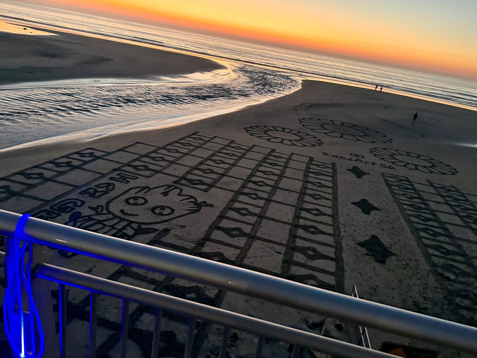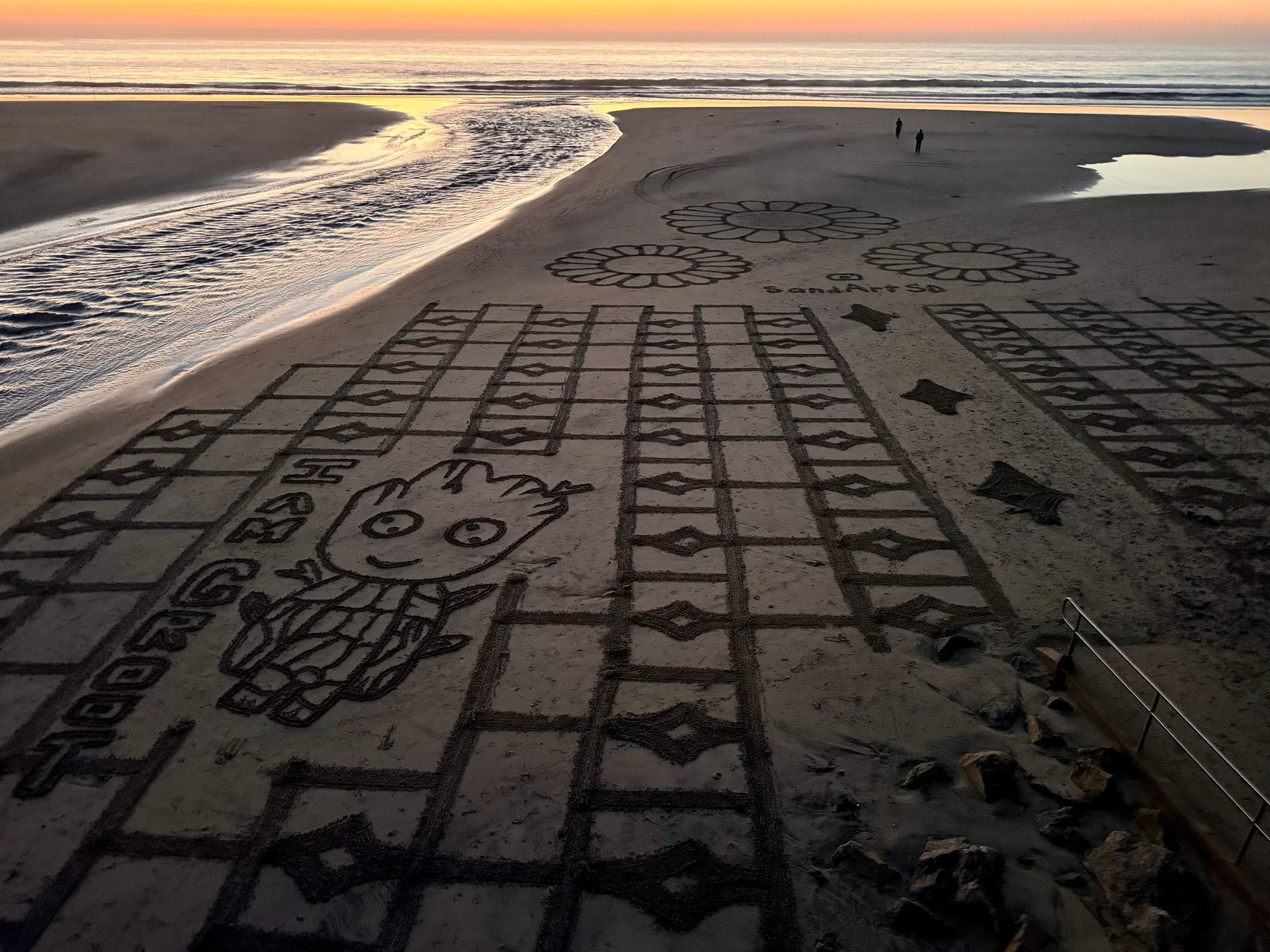 That’s why the medium is the deepest message. This art was made to disappear. And because it was made with that knowledge, it becomes a gentle practice of humility: to create something delightful without needing to keep it forever. Baby Groot, the symbol of new life, stands on sand—one of the most impermanent canvases on earth—under a sky that changes color by the minute. The result is a kind of coastal truth: we grow, we belong, we create, and we let go.